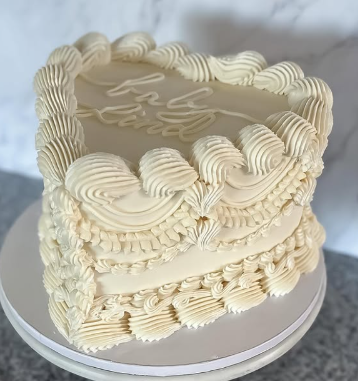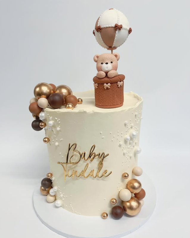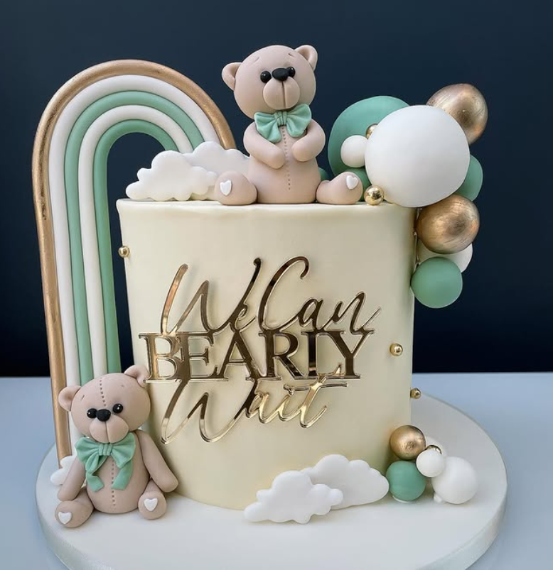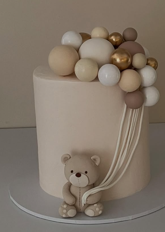 The Vintage Teddy Bear Cake is a delightful centerpiece for any baby shower. This cake features a charming teddy bear sitting atop a beautifully frosted two-tier cake. The soft colors and smooth frosting create a warm and inviting look, perfect for celebrating a new arrival.