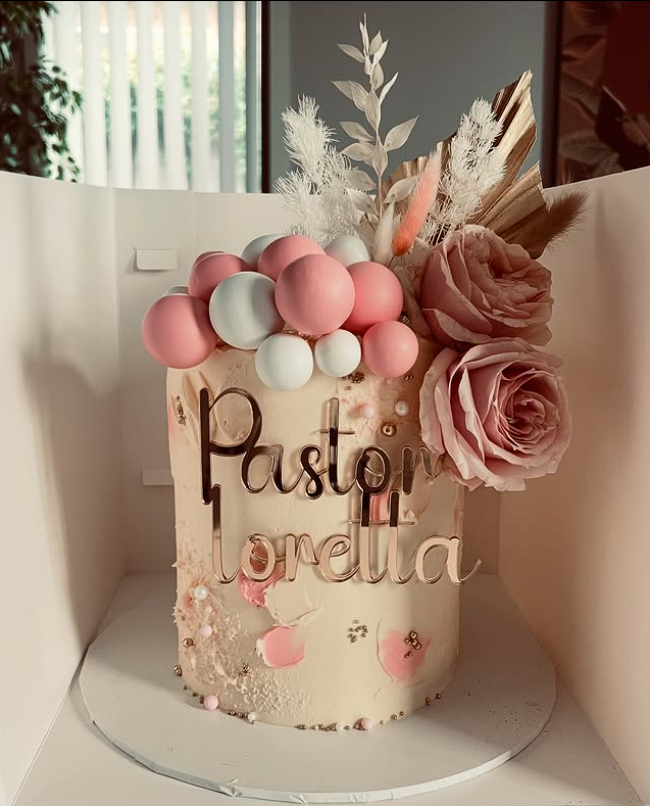 Surrounded by soft balloons and floral accents, this cake creates a warm and inviting atmosphere. It’s not just a treat; it’s a centerpiece that brings joy to the celebration.
