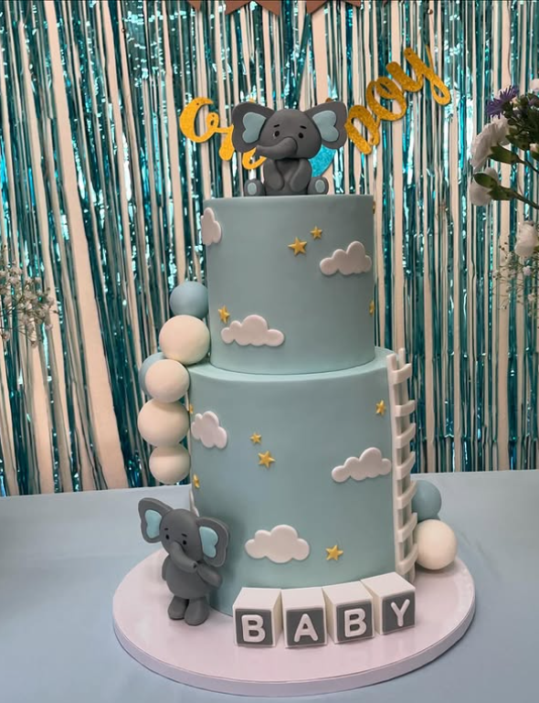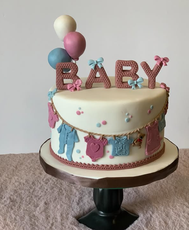 The cake itself is simple yet stylish, with smooth layers and a clean finish. The word ‘BABY’ adds a sweet touch, making it clear what the celebration is all about. Surrounding the cake are lovely decorative elements like small flowers and pastel balloons, enhancing the joyful atmosphere.