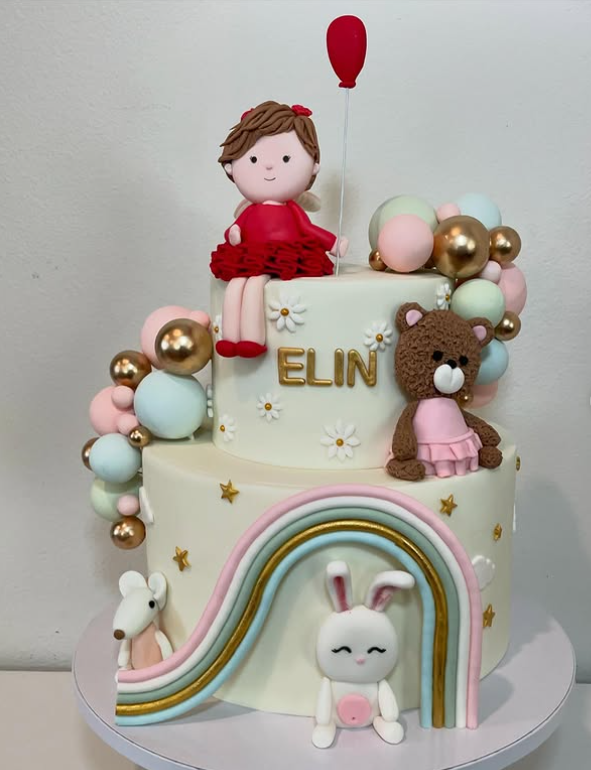Adorned with cute little figures like a duck and a bear, this cake captures the essence of childhood wonder. The pastel hues of pink and blue, along with delicate floral accents, add a touch of elegance. It’s perfect for celebrating the arrival of a little one.