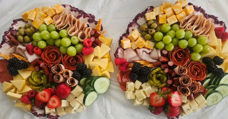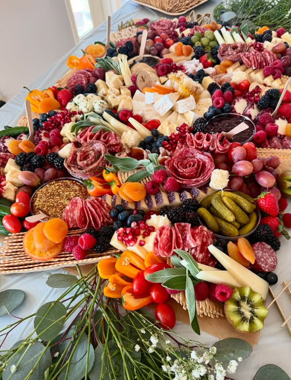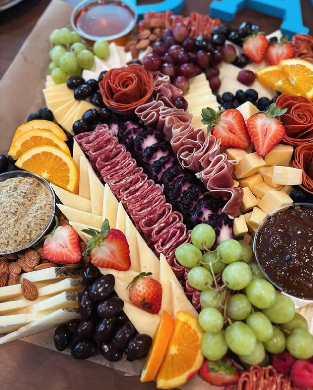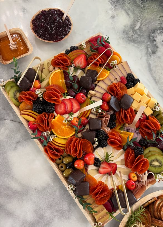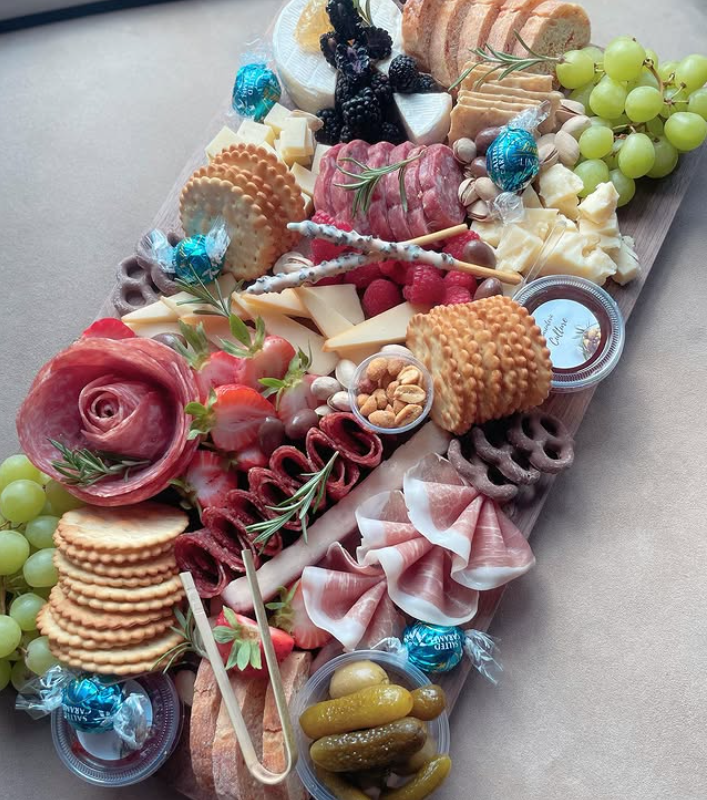 Featuring artisan cheeses, savory meats styled into roses, fresh grapes, berries, crackers, chocolate-dipped pretzels, and even pickles, it’s the perfect balance of sweet and savory.
