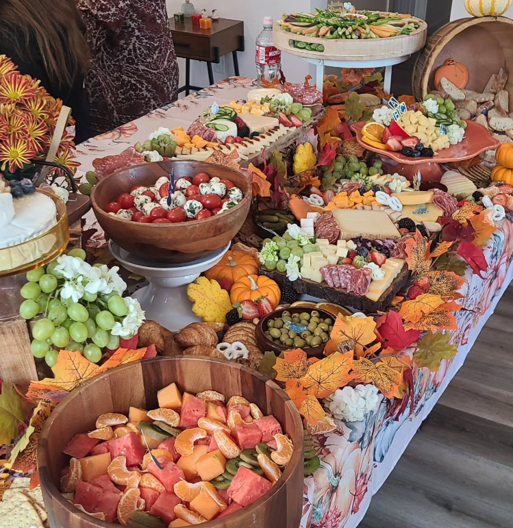 Styled with autumn leaves, mini pumpkins, and seasonal colors, the spread features an abundance of cheeses, cured meats, olives, fresh fruits, and veggie platters.