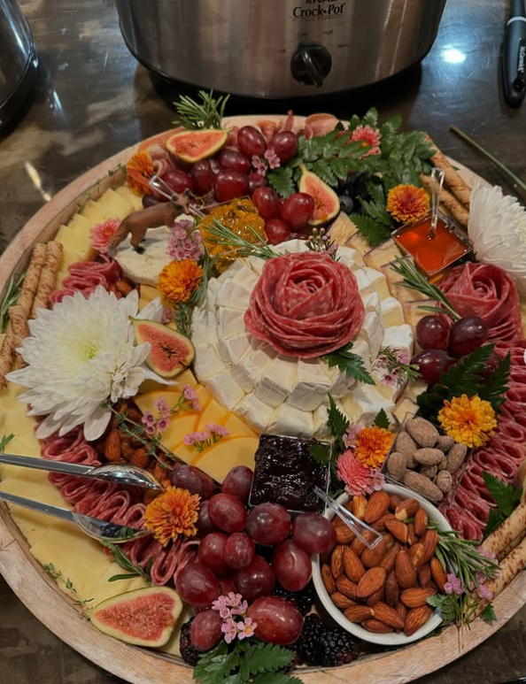 Featuring a centerpiece of creamy brie topped with a salami rose, it’s surrounded by fresh figs, grapes, almonds, honey, jams, and an assortment of cheeses.