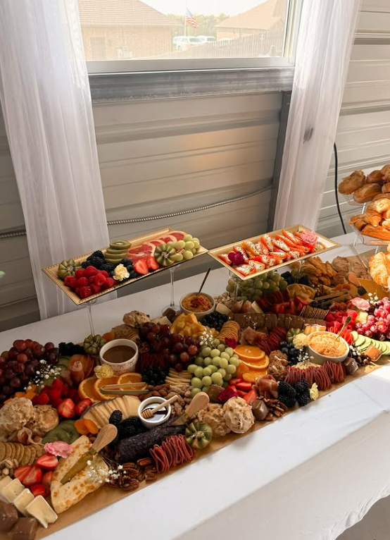 Featuring layers of artisan cheeses, fresh fruits, crackers, dips, and sweet treats arranged on elevated platters, it creates a gorgeous presentation that’s as delicious as it is eye-catching.
