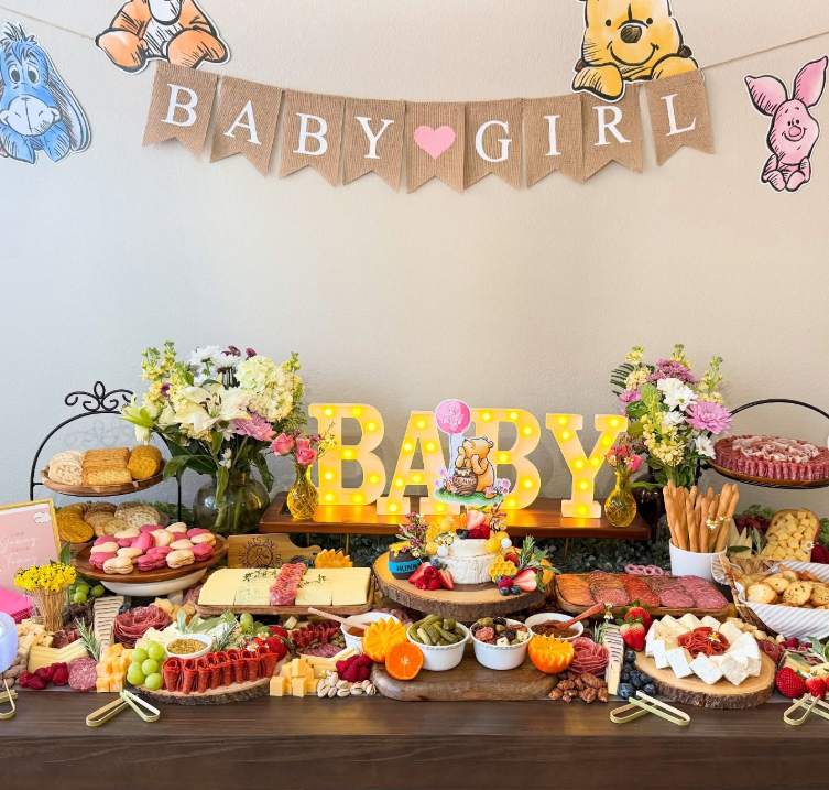 This Winnie the Pooh–themed baby shower charcuterie setup is as sweet as it gets for celebrating a baby girl.