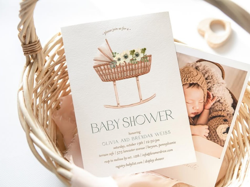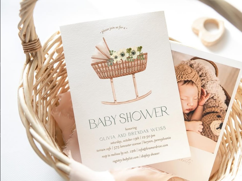 This rustic-inspired baby shower invitation features a charming wicker cradle filled with delicate florals, perfect for celebrating your little one in style.