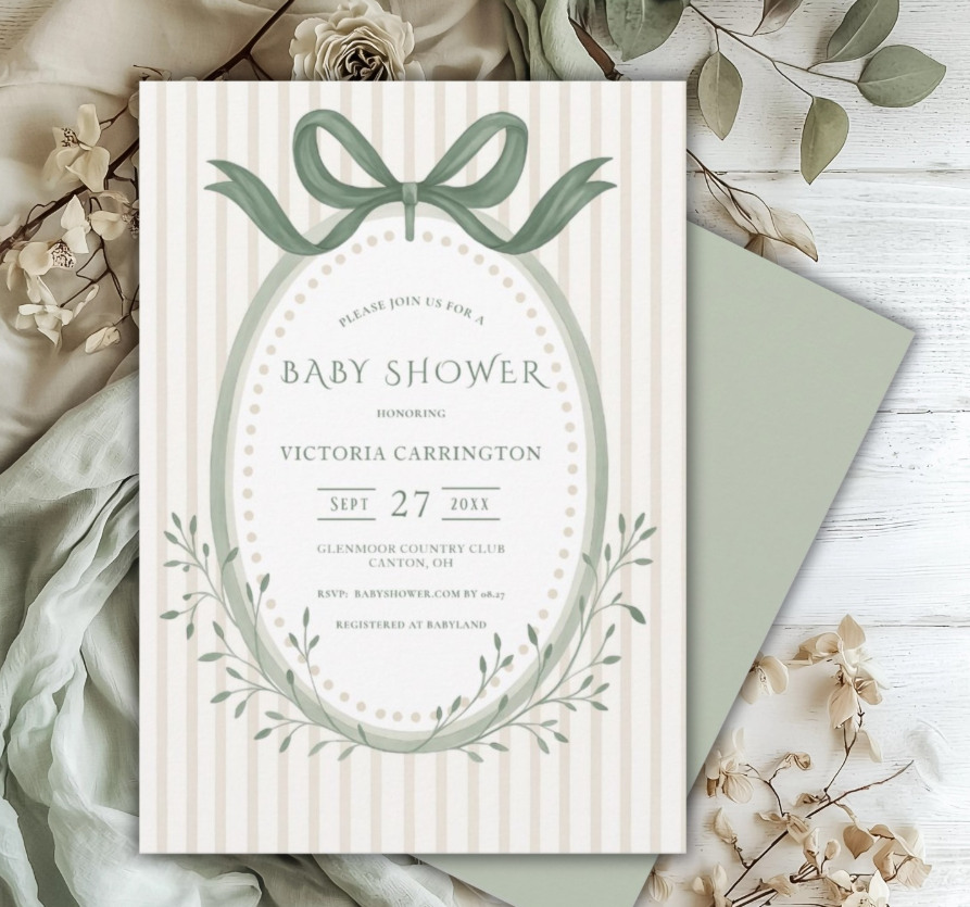 This timeless baby shower invitation features a chic sage green bow with delicate leafy accents, perfect for a classic or modern celebration.