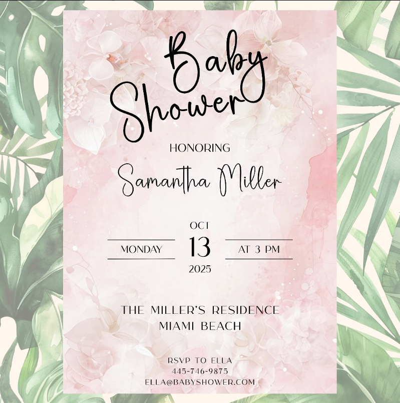 With its elegant script font and tropical leaf border, this design blends romance and modern flair, making it an ideal choice for garden parties, brunch showers, or beachside gatherings.