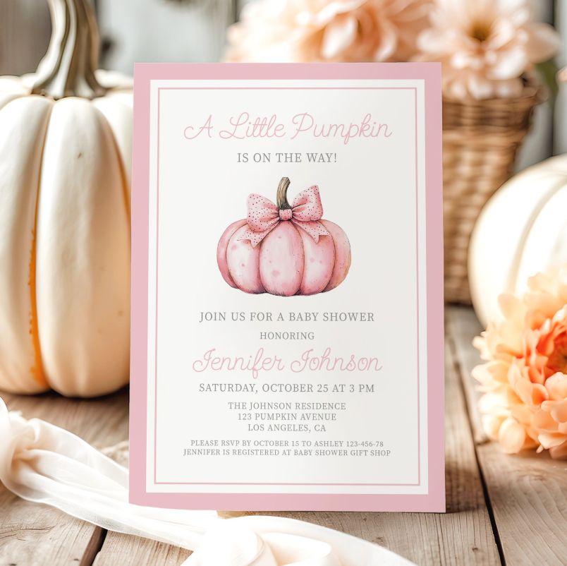 Celebrate the season with this adorable “Little Pumpkin” baby shower invitation in soft blush tones.