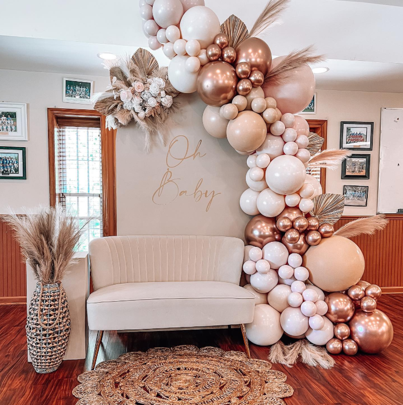 Create a dreamy boho baby shower with this stunning balloon garland in soft nudes and metallics, paired with pampas grass and a cozy lounge setup.