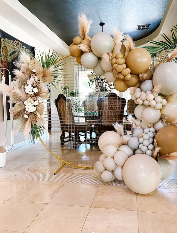 This boho-inspired balloon arch creates a breathtaking baby shower backdrop with its earthy neutrals, pampas grass, and dried florals.