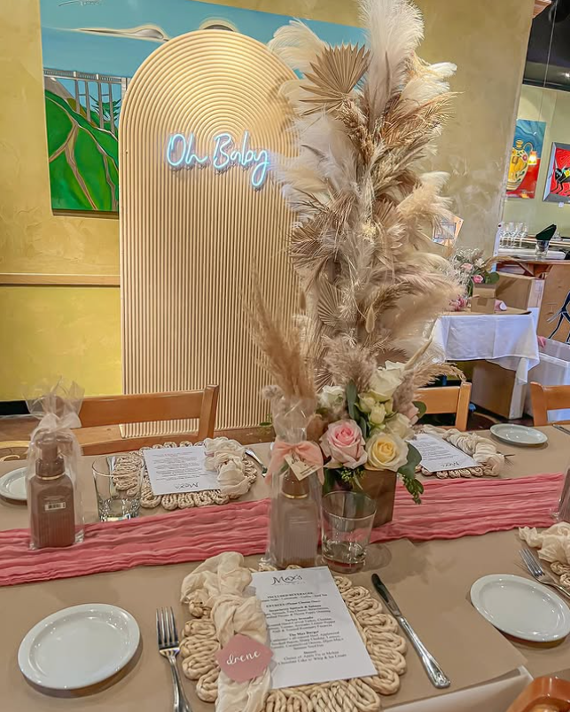 The “Oh Baby” sign makes it picture-perfect for photos, giving your celebration a warm, elegant touch.