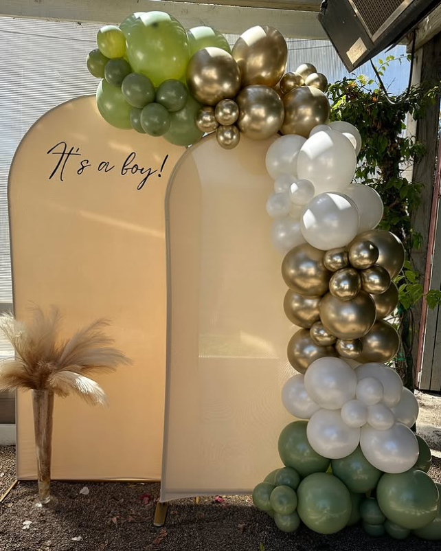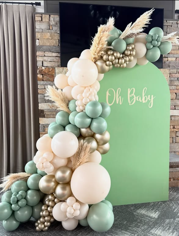 Celebrate in style with this modern baby shower backdrop featuring luxe gold, white, and green balloon garlands.