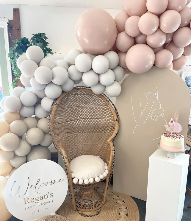 A rattan chair with a cozy cushion sits at the center, framed by cascading blush and neutral balloon garlands.