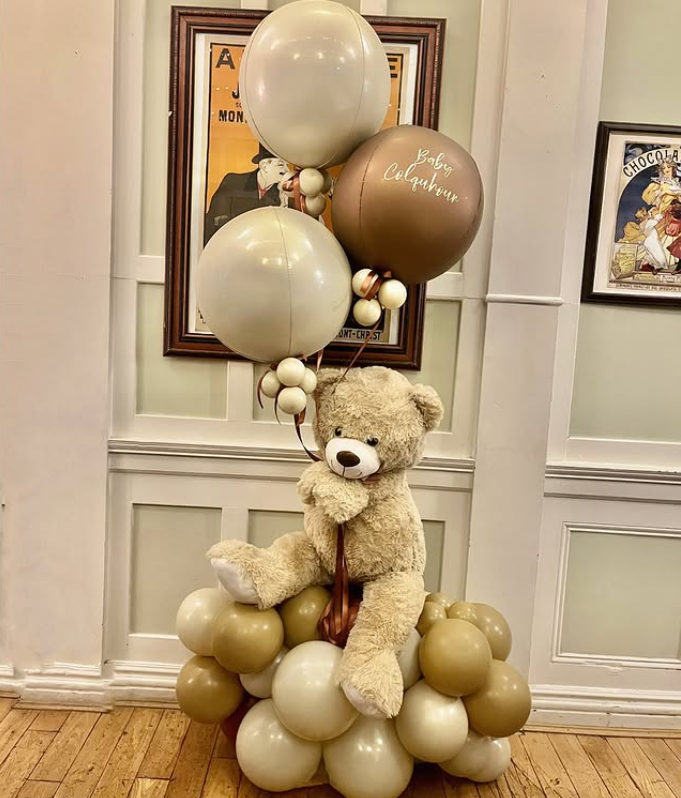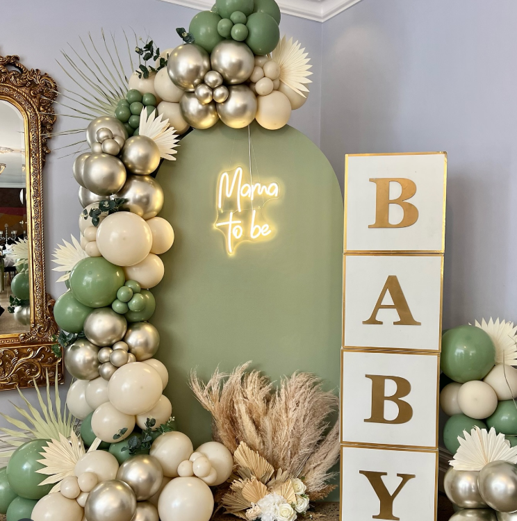 Balloons in soft shades of pink and cream float gently above, adding a festive vibe. The letters spelling ‘BAY’ hang cheerfully, marking the occasion. This backdrop is not just a decoration; it’s a space filled with love and anticipation for the new arrival.