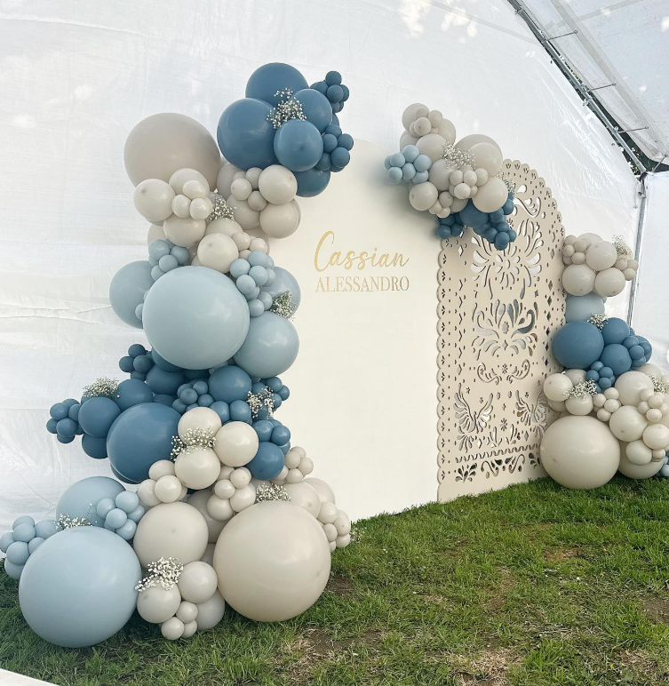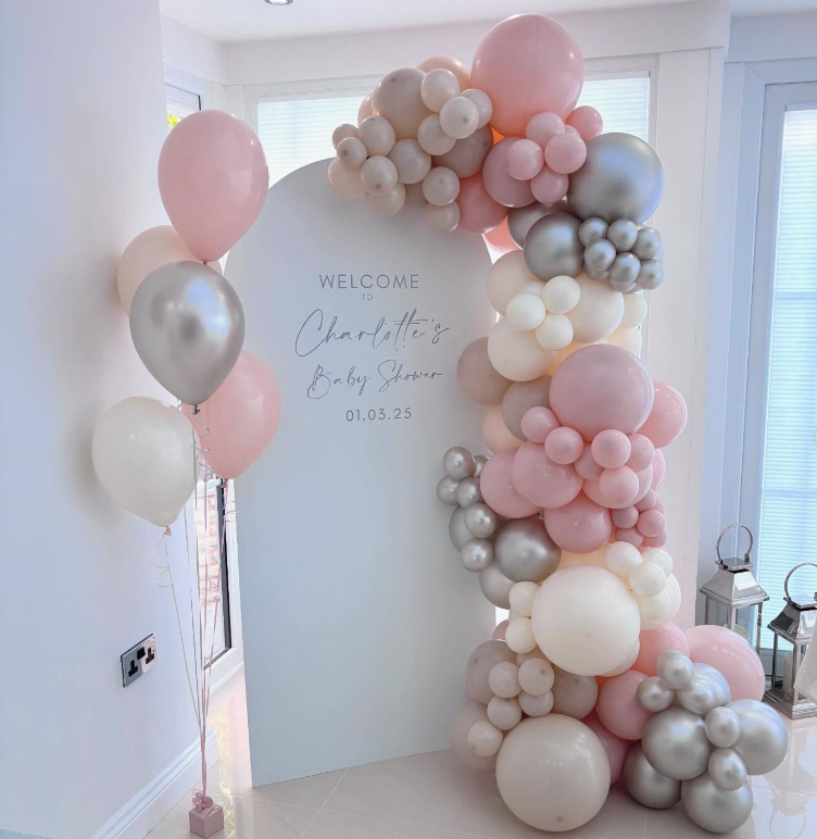 Underneath the arch, a beautifully decorated table holds a cake and treats, making it the perfect spot for guests to gather. The combination of the balloon arch and the sweet treats creates a delightful scene that captures the joy of welcoming a new baby.