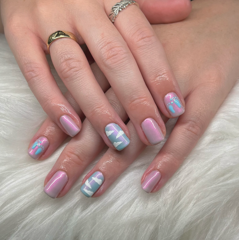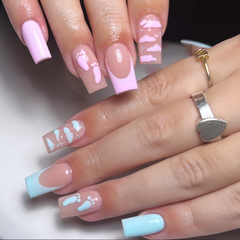 2. Baby Shower Nails with Footprints & Cloud Art in Blue and Pink