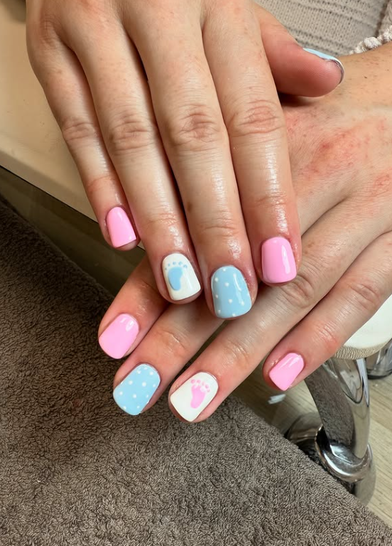 This adorable baby shower nail set features a sweet mix of pastel pink, baby blue, polka dots, and tiny footprints perfect for gender reveal parties or honoring both a boy and a girl.