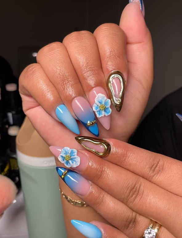 Turn heads at your baby shower with this striking nail design featuring ombré blues, gold chrome accents, and 3D floral art. The stiletto shape adds extra drama while the soft baby pink and blue tones keep it sweet.