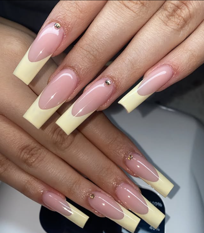 These classy baby shower nails feature a modern twist on the French tip with buttery yellow ends, a glossy nude base, and dainty gold studs for a chic finish.