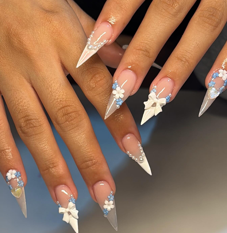 These dramatic baby shower nails feature sharp stiletto tips adorned with 3D white flowers, delicate blue accents, and pearl embellishments.