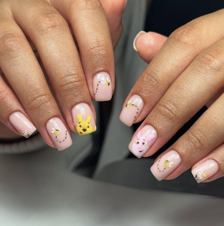 These adorable baby shower nails feature soft pink polish with playful bee trails and sweet character art inspired by Winnie-the-Pooh and Piglet.