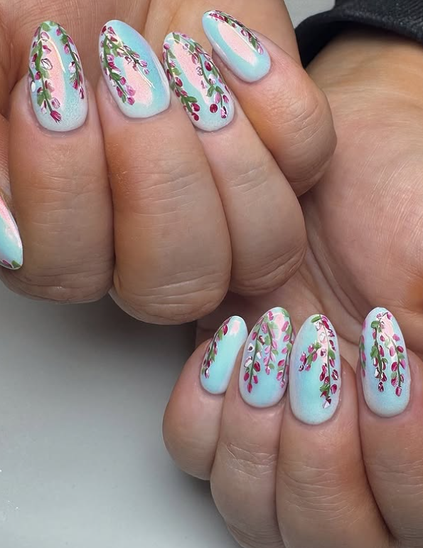These dreamy baby shower nails blend a soft pastel shimmer base with delicate hand-painted floral vines in pink and green.