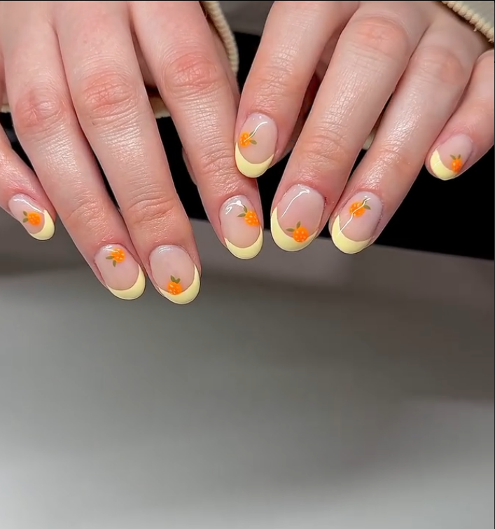 These cheerful baby shower nails feature pastel yellow French tips and tiny hand-painted orange flowers for a fresh, spring-ready look.