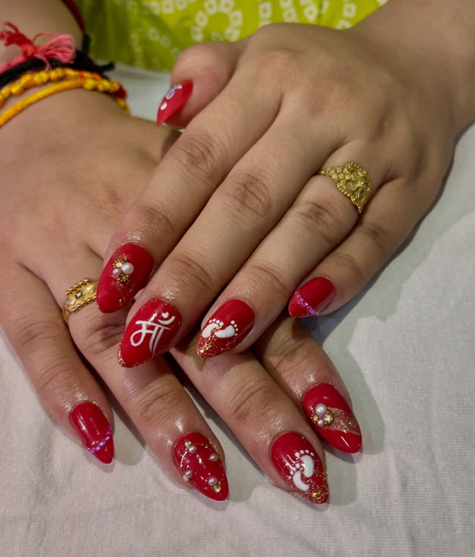 Celebrate motherhood in radiant style with these bold red baby shower nails, adorned with white baby footprints, gold glitter, pearls, and a beautiful Hindi “Maa” (माँ) script.
