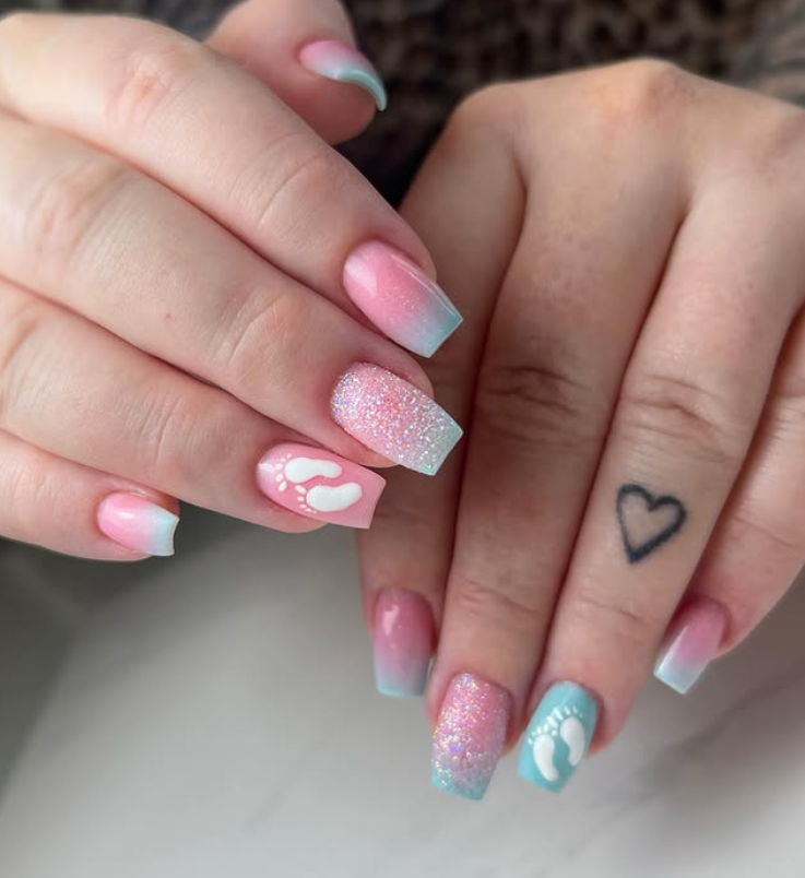 These dazzling baby shower nails mix pastel pink and blue ombré with sparkling glitter and adorable baby footprint accents.
