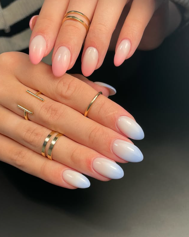 Elegant and minimalist, these almond-shaped ombré nails blend soft pink and baby blue hues—making them a timeless pick for any baby shower.