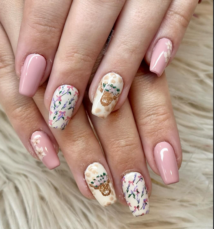 Soft blush tones meet whimsical charm in this baby shower nail design featuring dainty florals and adorable woodland animal art.