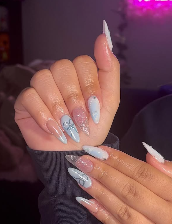 These stiletto-shaped baby shower nails dazzle with icy blue tones, glitter accents, rhinestones, and cute little bows—making them perfect for a baby boy celebration.