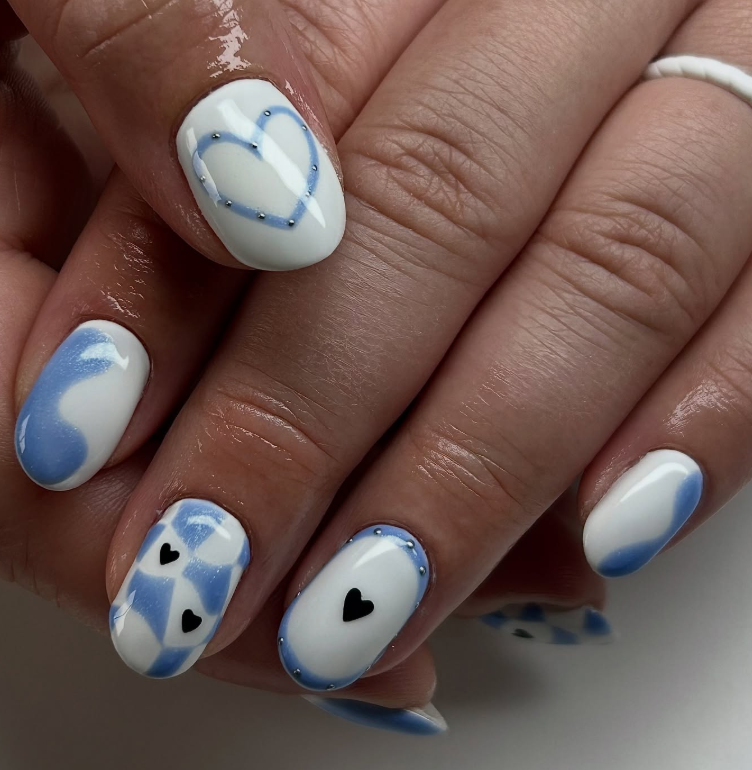 These playful blue and white baby shower nails mix trendy checkered patterns, abstract swirls, and heart details for a modern, artsy twist.
