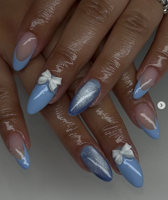 These elegant baby shower nails blend soft blue French tips, shimmer accents, and 3D white bow details for a polished, playful finish.