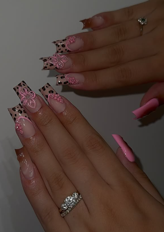 These fierce yet feminine baby shower nails combine glossy pink tips, trendy leopard print, and intricate 3D floral designs.
